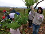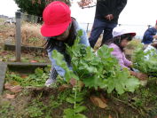 11/25(火)に1年生が大根を収穫しました。畑の先生から育て方を教えてもらい、種をまいたり、観察したりしてきました。「うんとこしょ、どっこいしょ…なかなか抜けません。」「見て、見て、だいこんがとれたよ!」1年生の元気な声が聞こえます。「お家の持って帰って、何にして食べようかな?」「おいしそうだなぁ」話は尽きません。立派なかぶもできました。