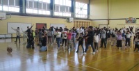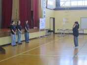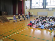 | 9月17日(水)の音楽朝会は、杉の子班で凧ばやしに挑戦しました。事前に練習していた6年生が他の学年に教えてくれました。左の写真は、その時の様子です。動きの確認ができたところで全校で輪になって踊ってみました。みんな楽しく踊ることができました。 |