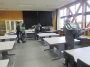まずは、机を移動して、空の書架を運び入れました。本もひとまず図鑑などを入れてみました。モニターやプロジェクター、スクリーンも整え、社会科や総合的な学習の時間の学習にばっちりです。先生方の研修にも使えますね。椅子も校舎内からかき集め、あっという間に明日から使えるようになりました。先生方のパワーに感謝です。
