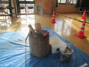 杉の子ルームには臼と杵が!写真ではよく分からないかもしれませんが、臼に熱湯を入れています。湯気が見えますか?臼は重くてびっくりです。