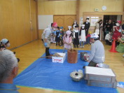 | 授業参観後は、お待ちかねのもちつき交流会です。御多用の中にもかかわらず、ご来賓が大勢来てくださいました。ご来賓が見守る中、もちつきが始まります。さて、じょうずにつけるのでしょうか? |