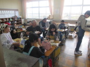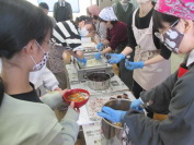 教室でもおもちを取って分けてもらっていました。おもちが「びよーん」と伸びる様子が面白かったですね。 |
