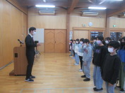さて、終業式は寒さが予想されていたので、体育館ではなく、杉の子ルームで行いました。体育館に比べるとちょっぴり狭いのですが、暖房の効いた温かい部屋で式を行うことができてとてもよかったです。校歌をみんなで歌った後、表彰式や3人の児童代表による発表を行いました。2学期に頑張った学習について話してくれた人や苦手だった大勢の人の前で話すことに挑戦して分かったことなどを発表してくれました。苦手なことにも挑戦することで、これまでと違う景色が見えてくるのだと改めて教えてもらいました。3人の皆さん発表ありがとうございました。