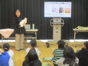 | 5年生のはみがき教室には学校歯科医の先生にもお越しいただき、「歯肉炎と歯周病」について教えていただきました。1,3年生の内容からはちょっとレベルアップです!歯を失うことのないように歯周病予防の磨き方やフロスの使い方を学び、さあ実践です。歯のみがき方が、レベルアップしましたね。 |