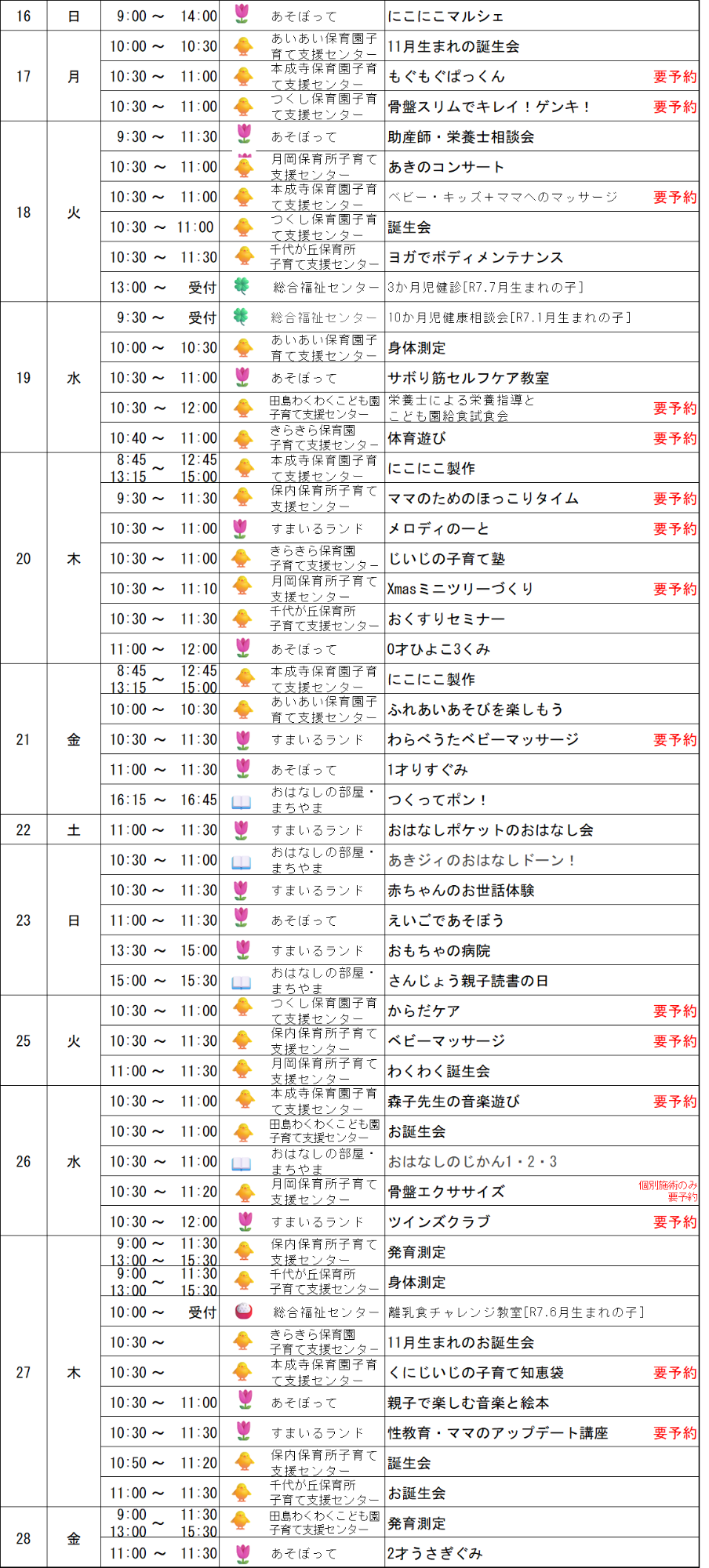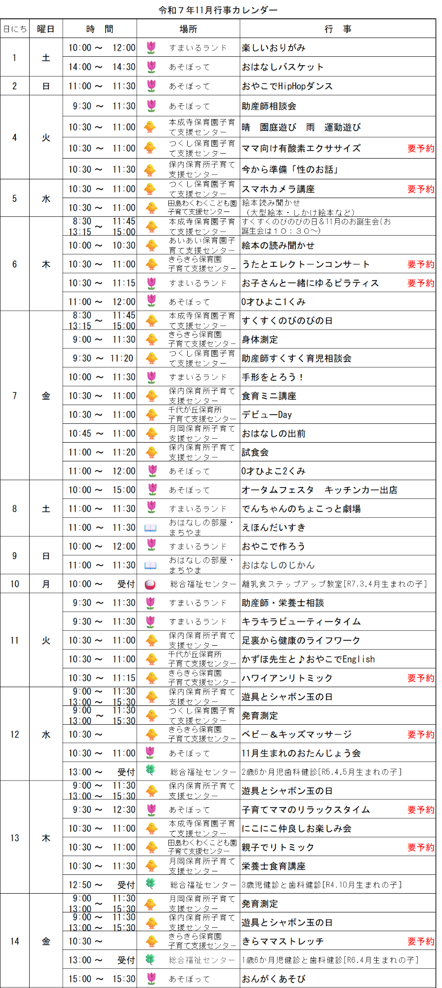 令和7年11月の子育てイベントカレンダー