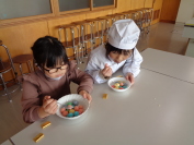2月14日(水)に、だんごパーティを行いました。旭小で収穫したお米を粉にした米粉を着色し、七色の虹色だんごを作りました。子どもたちは、「今までお世話になった先生方にも食べてもらいたい。」と考え、たくさんの量をこねて作りました。一人一人が25個程度のだんごを丁寧に作り、だんごをゆでている間にボウルを洗ったり、盛り付けの準備をしたりとみんながてきぱきと準備をしていました。先生方に渡すときは、「食べてください。」と手渡しして感謝を伝えました。先生方から「カラフルでおいしかったよ。」と伝えてもらうと、とても喜んでいました。