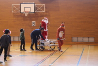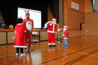 今週水曜日に行われた音楽朝会は、大盛り上がりでした。今月の歌を歌った後、体育館の後方から突然「メリークリスマス!」とサンタクロースの声が体育館に響き渡りました。子ども達は、「あれ?」という表情で、振り返ると、そこにはそり(リヤカー)に乗って手を振るサンタクロースがいました。もちろん、そりを引くのはトナカイです。サンタクロースが落ちないように気遣い、そろりそろりとそりを引いていました。その姿に子ども達は、「ワー。」「キャー。」と大喜びでした。その後、サンタクロースとトナカイと一緒に、楽しく今月の歌を歌いました。