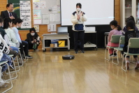 2年生からのサプライズもありました。「こんにちは。サンタさんに、プレゼントあげるよ。」「旭小に来てくれてありがとう。」と2年生が育てた大根をプレゼントしました。和気あいあいとした雰囲気で、とても楽しい音楽朝会となりました。