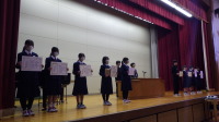 全校朝会の際に、生徒指導担当から連休中の生活の留意点について話をしました。(左写真)自転車事故だけでなく、例年、水難事故も全国で発生しています。そして、不審者に遭遇した際は迷わず警察に連絡してください。その後、学校にも教えていただければと思います。学校では、不審者に会ったら関わらずに逃げるようにと教えています。朝会では、休み中に行われた大会の賞状伝達も行いました。(右写真)連休となりますが、部活動などでけがをしないよう気を付け、いろいろ楽しみつつ、体も休め、また元気に登校してもらいたいです。