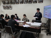 中学校は教科担任制ですので、複数の教師が学級に関わります。また、委員会活動、清掃活動、部活動などでも、多くの教師が生徒に関わります。学級や生徒の、いろいろな視点から見た姿を共有し、アイディアを出し合い、どうすれば学級が「自主 協和」する仲間としてレベルアップできるかを考えました。(写真は三条市が全体で行っているQU検査の結果をもとに、担任が学級の様子を説明しているところ)