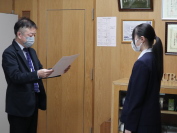 四中では3年生が社会科の授業で「税の作文」に取り組み、2名が入賞しました。三南地区納税貯蓄組合連合会会長様と三条税務署、三条市役所から担当者の方が来校され、校長室で表彰してくださいました。