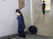 高齢者福祉施設つかのめの里から10名の職員の方がお手製の体験グッズをもってご来校くださいました。左写真は関節に新聞紙をまいたり、水の入ったペットボトルを首にかけたり、色を塗ったゴーグルを付けたりして、高齢者に近づく準備をしているところです。右写真はお金を財布から出して貯金箱に入れることを通して、お金の種類の判別がつかなかったり、つかみにくかったりすることを体験している様子です。この他にも、階段や色紙を使って、動きにくさ、分かりにくさを体感しました。つかのめの里では、職員の皆さんがアイディアを出し合って準備してくださったそうです。ありがとうございました。