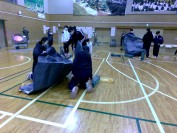 14日、第三中学校の体育館を使い、2年生が総合の防災学習として避難所体験をしました。2学年PTA協力のもと、蓋EST様より能登半島地震の被災地の様子をお話しいただいたうえで、学校の体育館に避難したときの生活を体験しました。寒い中での避難の辛さを実感できる時間になりました。