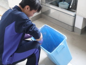 給食が搬入されるパンラックの床をデッキブラシで磨いています。(左写真)ごみ箱も手袋をして隅々まできれいにしています。(右写真)時間いっぱい、一生懸命、活動しました。