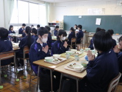 終業式では、各学年代表と生徒会代表が、今学期の振り返りを発表しました。式の後、吹奏楽、作文、書道で入賞した生徒を表彰しました。(左写真)今年最後の給食は、感染症拡大防止のため、残念ながら全員前を向いていただきました。(右写真)明日から冬休みです。新年に、生徒たちが元気に登校してくれることを楽しみにしています。