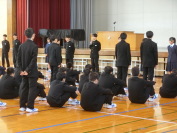代表者がそれぞれの決意を述べ(左写真)、全校生徒が一つとなり、互いの健闘を祈ってエールを送りました(右写真)。激励会の様子は、保護者の皆様や学校・学園運営協議会(コミュニティ・スクール)委員の皆様にご覧いただきました。