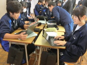 27日に予定している前期生徒総会に向けて、本部や各委員会などの目標や年間予定を審議する「学級討議」を行いました。資料はタブレットにアップされているので(左写真)、各自で確認し、グループで質問や意見を出し合いました。各教室には生徒会本部役員が出向き(右写真)、学級討議を支援しました。