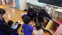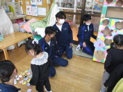家庭科の授業で、段ボールなどを使った幼児が楽しく遊べる「おもちゃ」をつくり、それを持って、学区内にある保育園を訪問し、保育実習を行いました。「おもちゃ」はプレゼントしたようです。