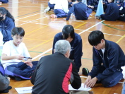 20日(土)に予定している体育祭の練習の様子を紹介します。本日は気温が高くなったため、室内で、入場の仕方の確認や競技の練習、作戦の相談などを行いました。(写真は全校生徒が参加する大玉送りの入場と練習の様子)次いで、チームに分かれて冷房の入る教室も使い、応援練習も行いました。
