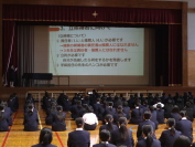 9日に自転車通学生を中心に、交通安全について指導を行いました。自転車自転車5則の説明や学校付近の危険箇所を写真で紹介し、注意を促しました。(左写真)10日には、集団生活を送る際に注意してほしいことや、授業やテストの受け方、家庭学習について話をしました。