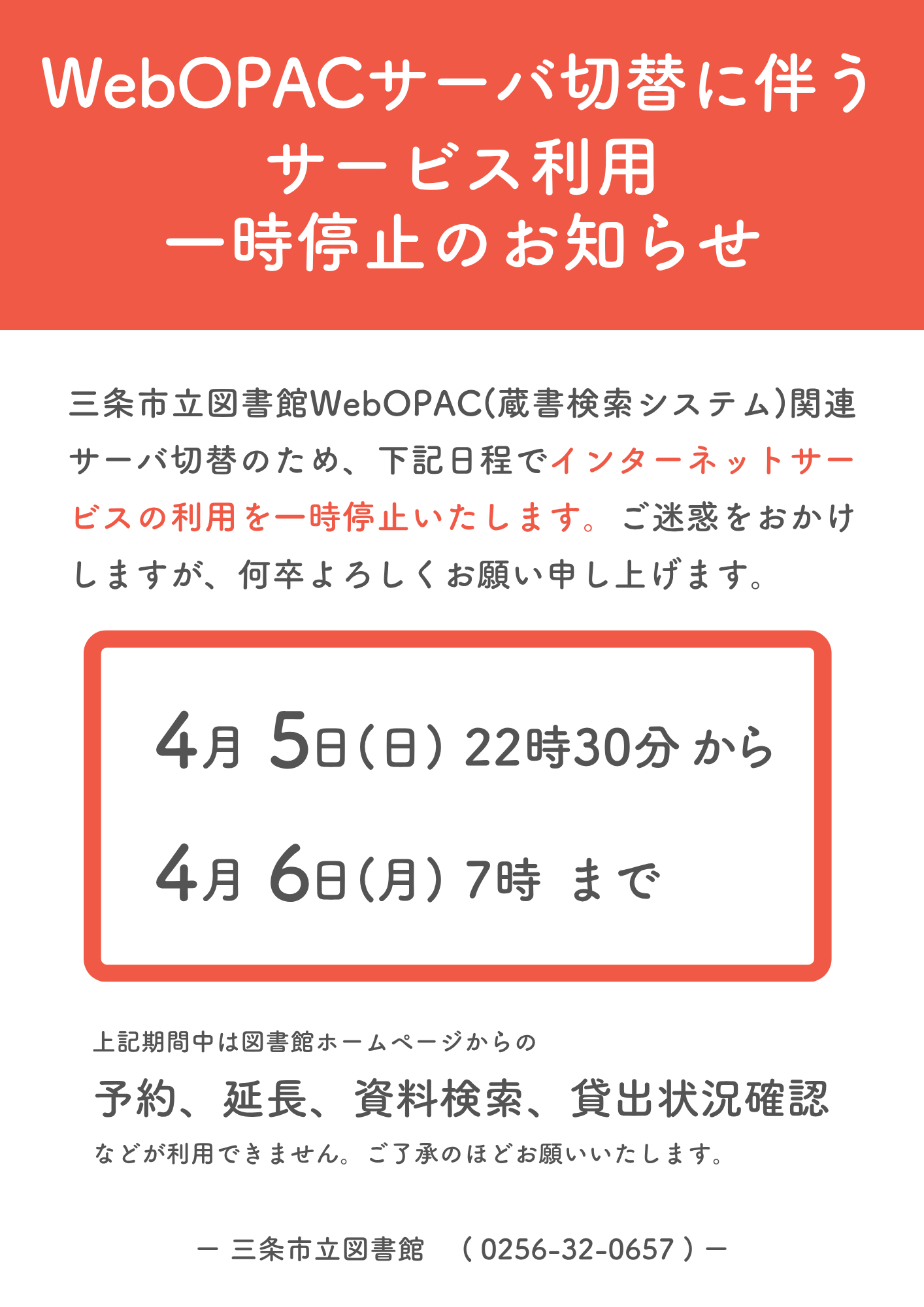 「WebOPACサーバ切替に伴うサービス利用一時停止のお知らせ(4月実施)」を掲載しました