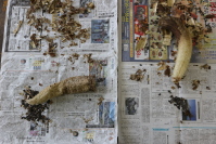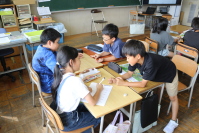 4年生は、ヘチマの実も収穫しました。早速種を採ったり、皮をむいてタワシにしたりする作業に入っています。(写真右)