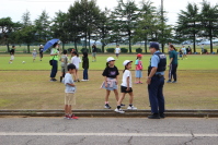 秋晴れの良い天気だったので、たくさんの子どもたちがグラウンドにやってきて、3人の方々とあいさつを交わすことができました。