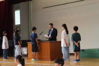 始めに、6年生の代表児童がお礼の言葉を伝え、次に1年生の代表児童たちから感謝の言葉の寄せ書きをプレゼントしました。