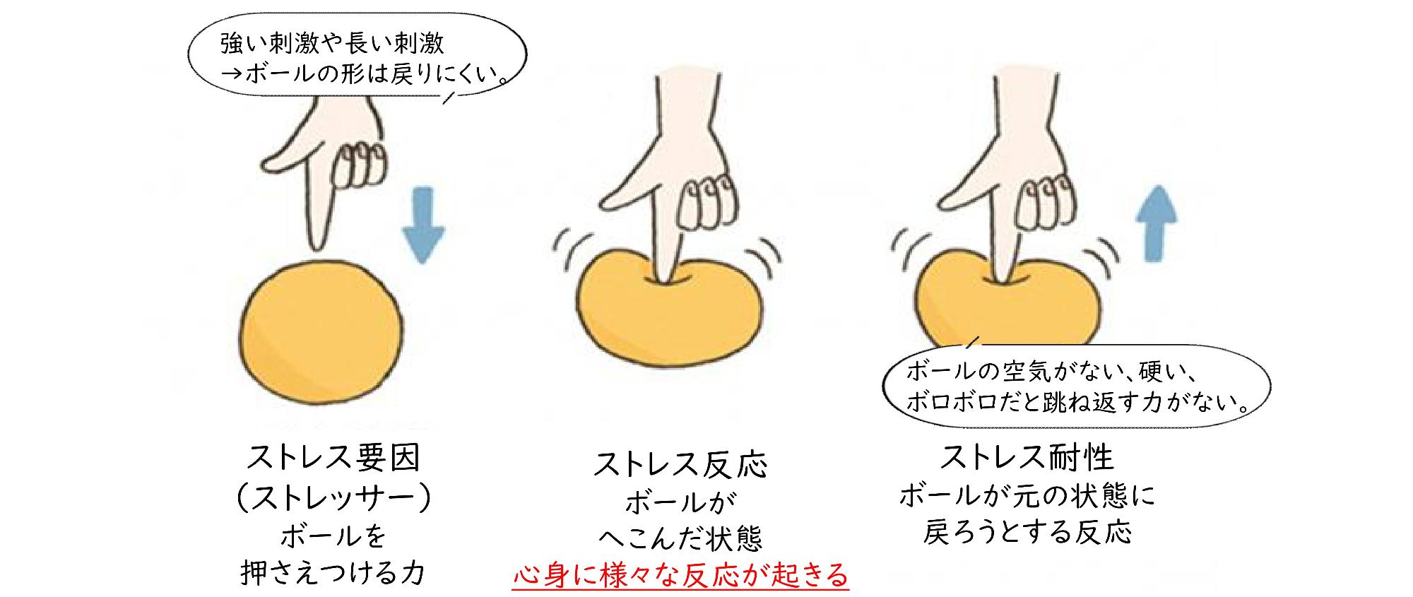 こころをボールに例えると、ストレッサーはボールを押さえつける力、ストレス反応はボールがへこんだ状態、ストレス耐性はボールの状態です。